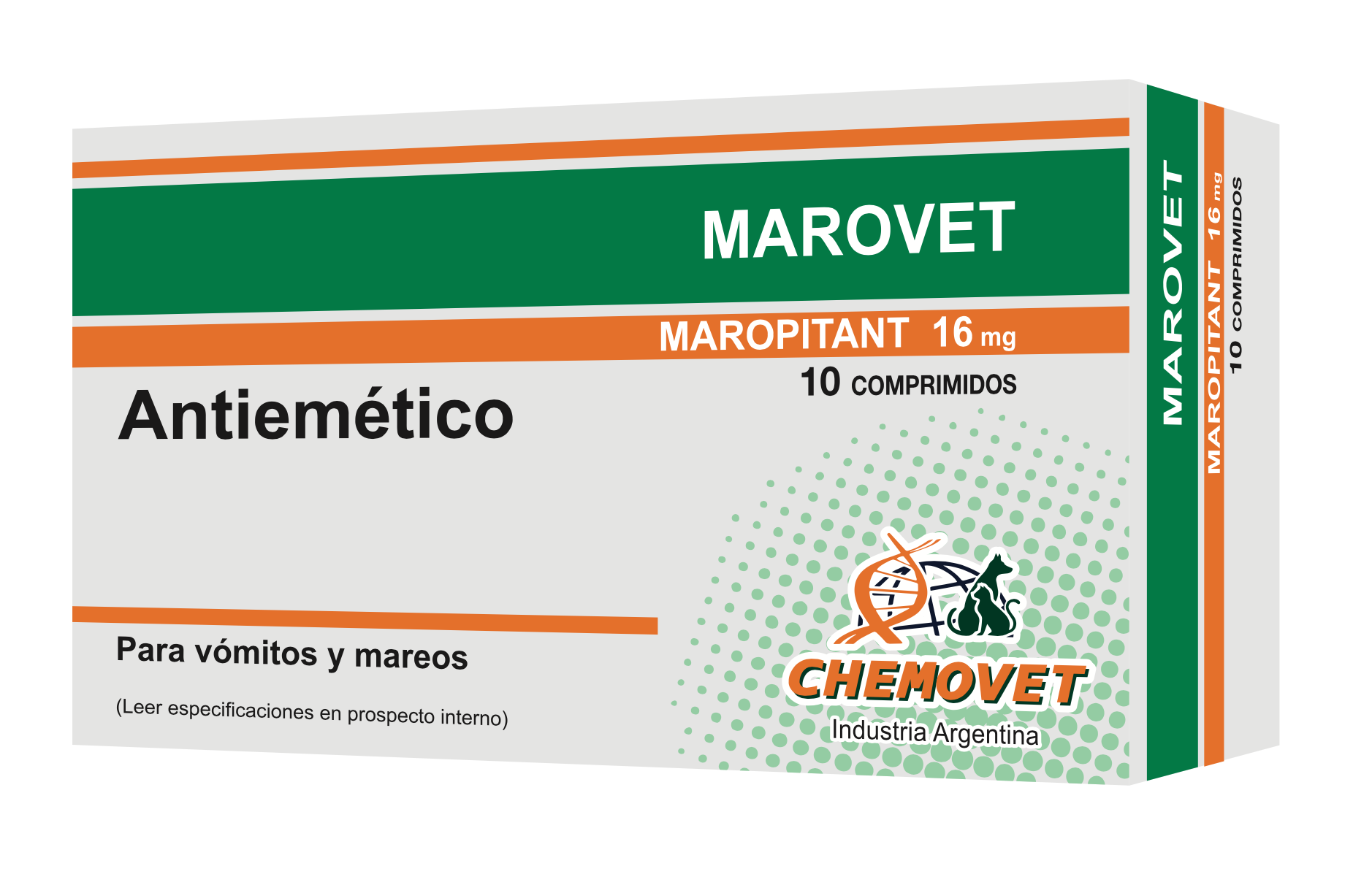MAROVET: Maropitant 16 mg (como citrato) - 1 blister de 10 comprimidos cada uno por estuche y un prospecto.