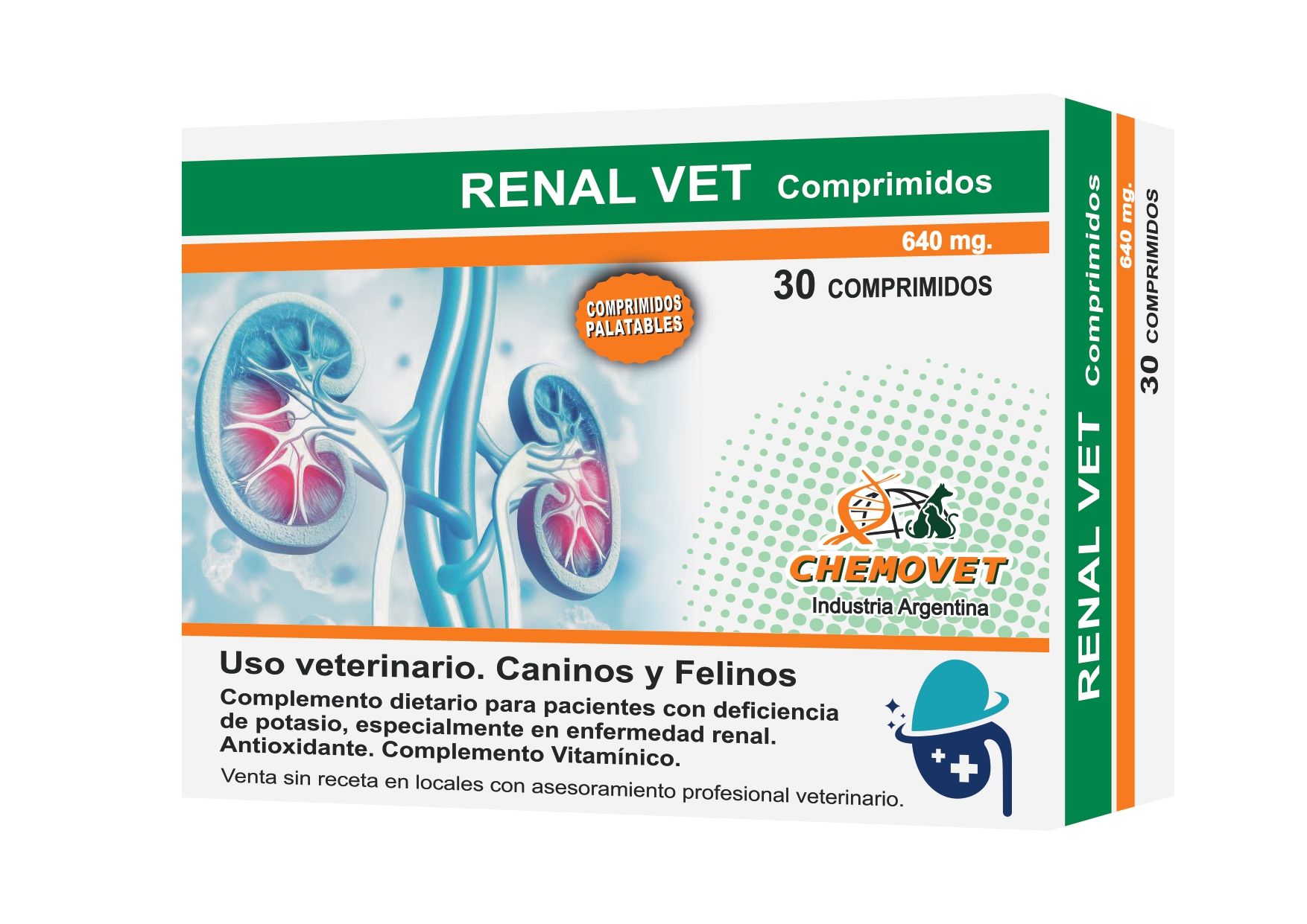 INDICACIONES DE USO: RENAL VET comprimidos es un complemento dietario para gatos y perros con deficiencia de potasio, especialmente en gatos con enfermedad renal y/o hiperaldosteronismo primario. Antioxidante. Ayuda a mejorar el metabolismo adecuado de los hidratos de carbono, lípidos, aminoácidos y purinas. Compensa las deficiencias nutricionales (principalmente vitaminas y minerales). Mejora la actividad y funcionalidad del sistema inmune. Finalmente mejora la calidad de vida del paciente con Insuficiencia renal crónica hiperaldosteronismo primario.